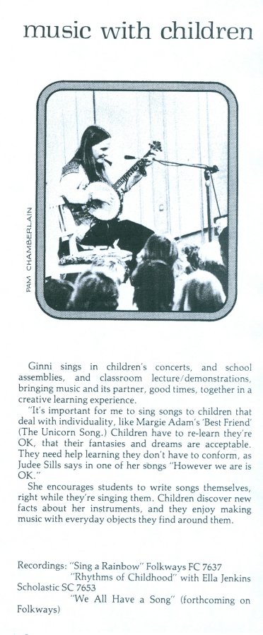 (1976) That was "Lady-O" and I followed it with the reprise of the title track from the "Long Time Friends" album, from 1976, on Ginni's Open Door Records label. I've got a special treat for you now. The next song was recorded live at the second annual National Women's Music Festival. That festival was held in 1975 at the University of Illinois in Champaign. And the song Ginni Clemmens sang was one many of you fans of women's music will know. It's "Best Friend (The Unicorn Song)," which was written by Margie Adam. That means you're hearing a version recorded a year before Margie Adam recorded it herself on her first album, and also a year before it appeared on Ginni's "Long Time Friends" album. Ginni Clemmens - best friend (the unicorn song) (1975) That was "Best Friend (The Unicorn Song)" as sung by Ginni Clemmens at the 2nd National Women's Music Festival in 1975. Ginni Clemmens was a quiet force in the Chicago folk scene for over 25 years, and then in the late 80s she moved to rural Indiana, and then a few years later moved again to Hawaii, where she continued to write and perform. In celebration of her 65th birthday in 2001 she released her seventh album, inspired by living on Maui. It was called "Underneath Hawaiian Skies." While many of the songs are filled with her insight, humor and eloquence, she couldn't do an album without a sassy blues song. So that's what I'm going to use to close this tribute to her. It's called "Volcano Mama (Geothermal Blues)." Ginni Clemmens - volcano mama (geothermal blues) (2001) Again, that was "Volcano Mama (Geothermal Blues)" from her last album, "Underneath Hawaiian Skies." While it is tragic that Ginni Clemmens was killed in a car accident, we are blessed that we have her music, and her spirit, to enrich us. She will be missed. Ginni Clemmens - I can sing a rainbow (reprise)