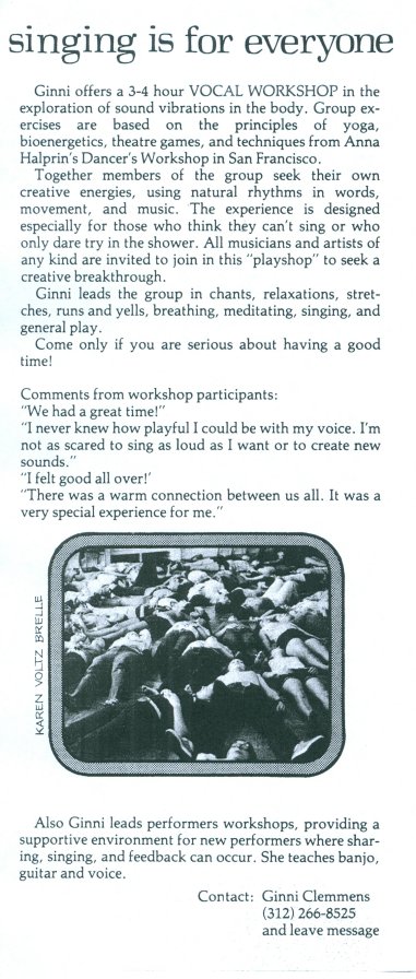 Script for Queer Music Heritage, April 2003 I Charlie Murphy Intro Hello, welcome to tonight's edition of Queer Music Heritage, which I think you'll find will be packed with history and humor. The humor will come in the second half when I'll feature an interview with those dragapella divas, the Kinsey Sicks. The first part of the show will be a tribute to one of the influences of the women's music movement, Ginni Clemmens. I've been planning a segment on her for quite some time, but now it carries a special sadness, because she was killed in an car accident near her home in Hawaii on February 15th, just a few days before her 67th birthday. Before I get into some of the history of Ginni, I want to play a song she recorded on a various artists compilation. The compilation was called "Gay & Straight Together" and she produced this album in 1980 on her own label, Open Door Records, in Chicago, and Folkways Records also issued the album that same year. The album included Charlie Murphy, who you heard in my intro, and several other artists I've played in the past. Again, it was called "Gay & Straight Together," and with her typical spirit she wrote on the album notes that it was brought into existence to promote understanding, acceptance, and support between different lifestyles. The album contained a mix of gay and straight, young and old, and male and female artists, and for her own song on the album, Clemmens chose one written by folksinger/songwriter/activist Malvina Reynolds, called "Love Somebody." Ginni Clemmens - love somebody (1980) Ginni Clemmens had a long history in music, and it went back much further than her involvement with the Women's Music Movement. In the late '50s in Chicago she got started in folk singing, but she did not limit herself to one style. For example, she decided to take up the banjo, not your typical woman's instrument in those days. And she also included blues songs in her performances, which she continued to do throughout her career. But she wasn't a full-time musician. She was also a recreational therapist working with retarded children. And she found that music, and especially getting them to sing together, was a useful way to reach them and to help them feel less alienated from one another. This led in 1965 to her first album, called "Sing A Rainbow & Other Children's Songs," on the Folkways label. Here's a bit of one of the songs from that album. Ginni Clemmens - sing a rainbow (1965) So, by the late '60s and early '70s, she had progressed from folk and blues to children's music, but for the people who like to classify artists, she was about to confound them even more. Here is a quote from her that explains the catalyst to her next progression. "I heard Cassie Culver sing, and Margie Adam. And they were singing songs coming our of a feeling of strength and integrity in being women, and it gave me a different perspective on what it meant to be a feminist. I saw that it didn't have to be man-hating, but rather a belief that women could be strong, and independent if they chose to be, and that it was important that they have that choice." This realization led her more and more toward performing at women's gatherings, meetings of the National Organization of Women, and feminist conferences. One of her most known blues songs was also one of her first feminist songs, "Wild Women Don't Get The Blues." It was written by Ida Cox in the 20s and using it to promote feminism, Ginni Clemmens brought a whole new meaning to it. Ginni Clemmens - wild women don't get the blues (1981) Ah, yes, those wild women don't get the blues. That song was one of the staples of her repertoire, and she recorded it twice. The first time was a more acoustic version on her 1976 album "Long Time Friends," and then she recorded the version you just heard and made it the title track of an album in 1981. But her influence went further than just her songs. You've heard me mention many times on this show of Ladyslipper Music as being one of the main sources for recordings by lesbians. I was able to get some short interview comments about Ginni from Laurie Fuchs, who was the primary founder of Ladyslipper. In 1976 Laurie began Ladyslipper because there just were no sources for women to buy the early recordings from the artists they would hear about or see at the women's festivals. So, as you'll hear, Laurie started a mail order business, which is still going strong today. You can find it on the net at www.ladyslipper.org. Laurie starts out her comments by telling about her first exposure to Ginni Clemmens. Laurie Fuchs Comments on Ginni Clemmens: When I went to the first festival for me, which was 1976. It was actually the 3rd National Women's Music Festival, in Champaign-Urbana. For some reason, one of the strongest memories I have is round robins just cropping up, and there would be Ginni, with her banjo. And so from that time many many people went away from this festival just being very inspired to go home and start something as their participation in cultural and political we considered it cultural and political work at the time. And I really think that Ginni Ginni's presence helped foster that feeling of this being something that we were all invited to participate in Can you tell us something about the influence of her music itself? There were a few things that were really notable on her early LP "Looking For Some Long Time Friends" that I remember. One was that she performed a song called "Lady-O," I think this was by someone called Judee Sill. But it was one of the really early lesbian songs that I ever heard. And I think the title of her LP, "Long Time Friends," sort of captured some of the spirit of the early women's music and culture movement. And another thing that I think she contributed was there was a real sort of do it yourself sense that she brought to this. Women started making their own cassette tapes and just sort of doing some general things that have become much more popular 