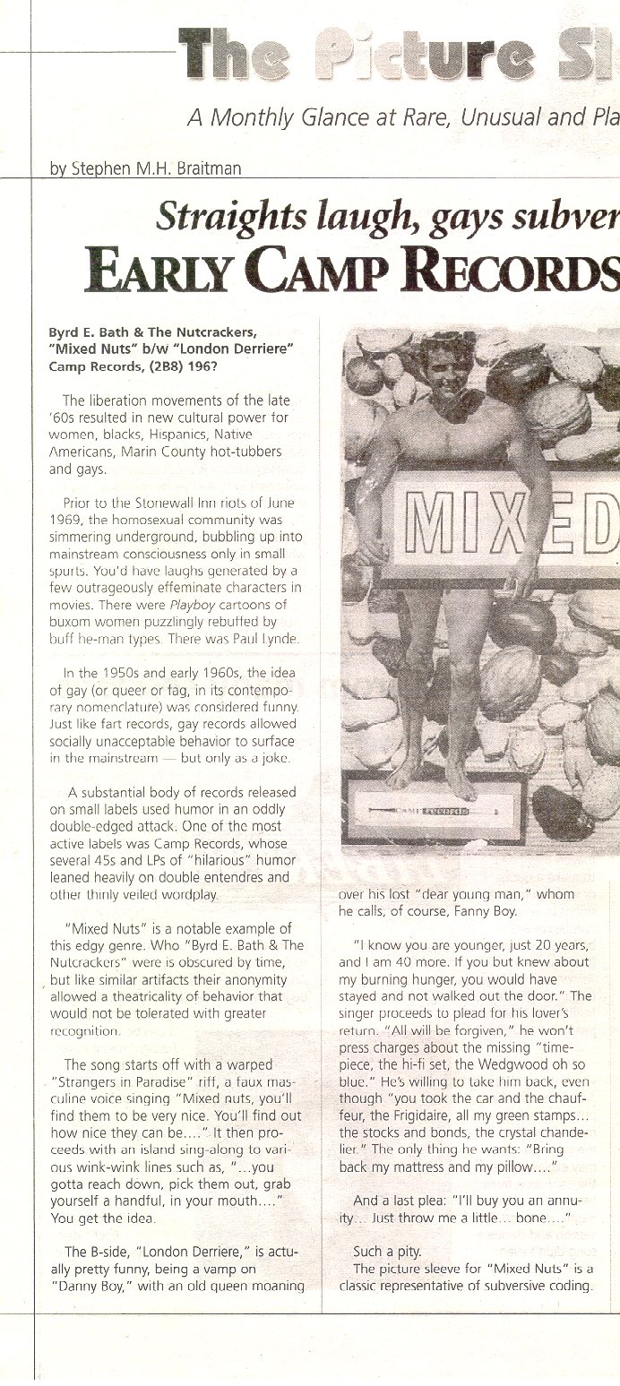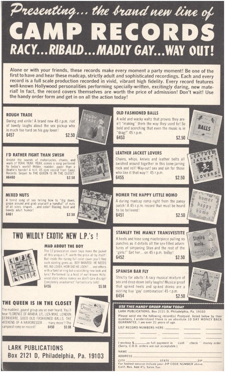 Almost nothing is known about the mysterious 60's record label Camp Records. They released an album and ten 45 rpm records of gay parody songs, most done with effeminate voices. I believe they were issued in the early 60's, as they all appeared in an ad in the gay magazine Vagabond, dated 1965. The address on the album record jacket was PO Box 3213, Hollywood, California, and it credited all selections to "Different Music Co, Hollywood." The "Queen Is In The Closet" LP was released at least as early as June 1964, as an ad for it appeared on the back cover of that month's issue of "One Magazine." And, of course, as we do not know who released these records, we do not know if they were meant to make money from laughing at gay people, or if the producers were gay themselves. The artists singing most of the songs were uncredited, or with names obviously made up, like Byrd E. Bath and B. Bubba, but one name stands out, Rodney Dangerfield. That name credited on one of the songs, and possibly another. This would have been very early in Dangerfield's career, as his website bio says he decided to devote his career to comedy at age 40, which would have been in 1961. But I don't think it was the comedian we know; just a prop name used for the release. Dangerfield disclaims any knowledge of it, and it's been reported that "Rodney Dangerfield" was used as a pseudonym for performers going back to at least the thirties. The name is used as an in-joke for various characters on Old Time Radio series years before the Rodney we know came along. A second album released on the label was called "Mad About the Boy." It was filled with mostly well-known Broadway and cabaret songs that were originally sung by women. This album kept the pronouns intact, making them very gay. They were done in lounge style, without a campy approach...in other words, done "straight." The liner notes state: "The primary reason for doing this album was to prove that good songs could and should be sung by everyone. Gender should not be the determining factor as to who should sing what." The notes later say that the male soloist and other artists on the album are well-known "Hollywood, TV, and screen personalities" but "we are not at liberty to reveal true names." I have no idea if all this is true, or simply hype. The album probably came out in 1964 or 1965, as it pictures on the back all the previous releases of the label. And it is also advertised in the 1965 issue of Vagabond (see more, below), so I believe it was the last record they released. An amusing characteristic of the records they issued was the "label numbers" they gave them. Almost all of them are tongue-in-cheek gay references, if the letters and numbers are read individually. For example, ICUR1-2 becomes "I see you are one, too" or variations of that, along with 2B8 I believe being "to be ate." "45CC" for the single "Spanish Bar Fly" is likely referring to "45, Si, Si," and "OUR 2-2" could be "our tutu." And the "Mad About the Boy" album's numbering was "RU-1," which of course is "are you one?" meaning "are you gay?" In 2012 I was able to interview Murray Garrett, the producer of an LP called "Love Is A Drag," where the gimmick was it was all songs sung to a male, and sung by a male. It was released in 1962 with a veil of mystery, as the singer was not identified. My interview unveiled his name, fifty years after the album's release. As this LP preceded the Camp Records album "Mad About the Boy" by several years, I asked Mr Garrett if he had any information. He had heard of it, but never knew who was behind it. And he was in a position to know, as he was on the West Coast Board of NARAS. He remembered people calling him up asking about the Camp album, but he never heard the back story. So, what was the intended market for these recordings? I think it could go two directions, with one providing amusement for straights wanting to laugh at their perception of gay men. The other market was gay people themselves in providing the common sense of humor in their secret lives. The humor that exaggerated the campiness, the mincing, and the swishing...even with their negative stereotypes, could have provided some sense of community. In those days, when almost everyone was in the closet, and fear of persecution or worse was very real. It was really all they had. Where would you locate copies of these records? I suggest "bookmarking" them on eBay, and then be prepared to wait a while for them to show up. I regularly monitor eBay for gay-related recordings and in the last few years ones from Camp Records now rarely are featured. As trivia, I personally found the single "Mixed Nuts" hardest to find, taking me a number of years. In general they all show up so rarely I could not pick one to call the most common or easily found. I've tried to give as complete a history as possible of this label, as it's truly unique to our culture. I show scans of all the records in my collection, and you can hear them as well. I don't think anyone as ever tried to do justice to this subject, but there are still many unknowns. If anyone reading this has additional information, please, please contact me. So, enjoy the photos and music...they are indeed very rare and give a unique look at gay humor of that time. JD Doyle CAMP RECORDS DISCOGRAPHY