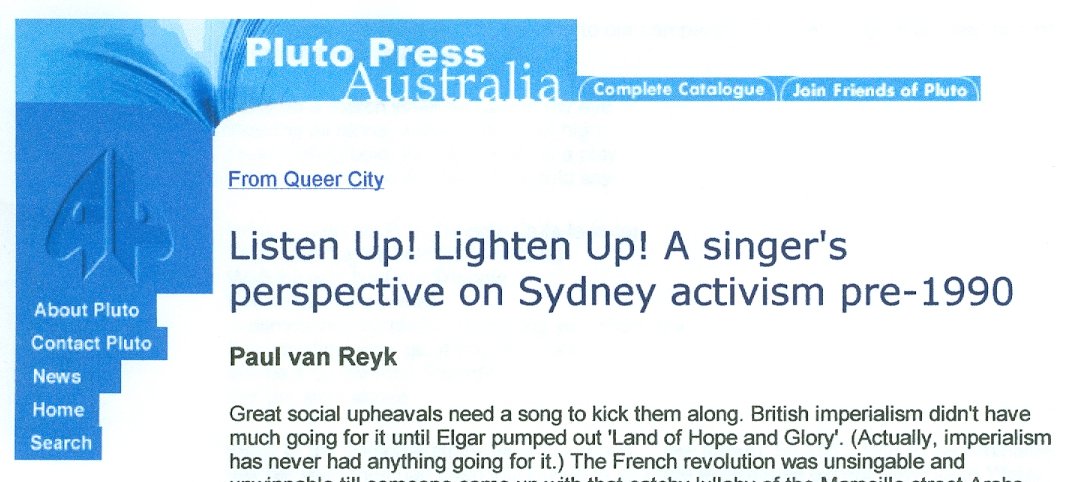 Quire. Gary had this description of the photo: "The colour one was taken at our performance at a Marxist Summer School in 1981 or 1982 (I think) at the University of Sydney campus. These Summer Schools were for radical academics discussing Marxism and other like theories, so we decided to wear second-hand army shirts covered with political buttons as if we were 70s student radicals (the dress here at that time and, of course, many of us had been such). That's me in back playing the recorder"
