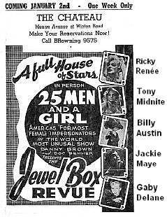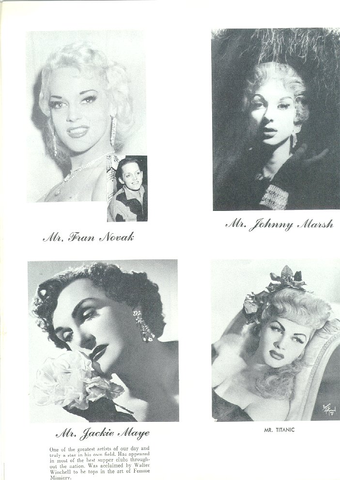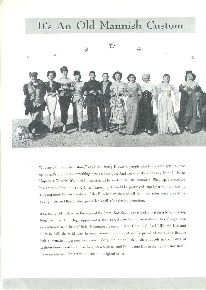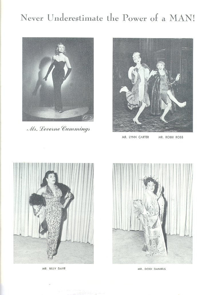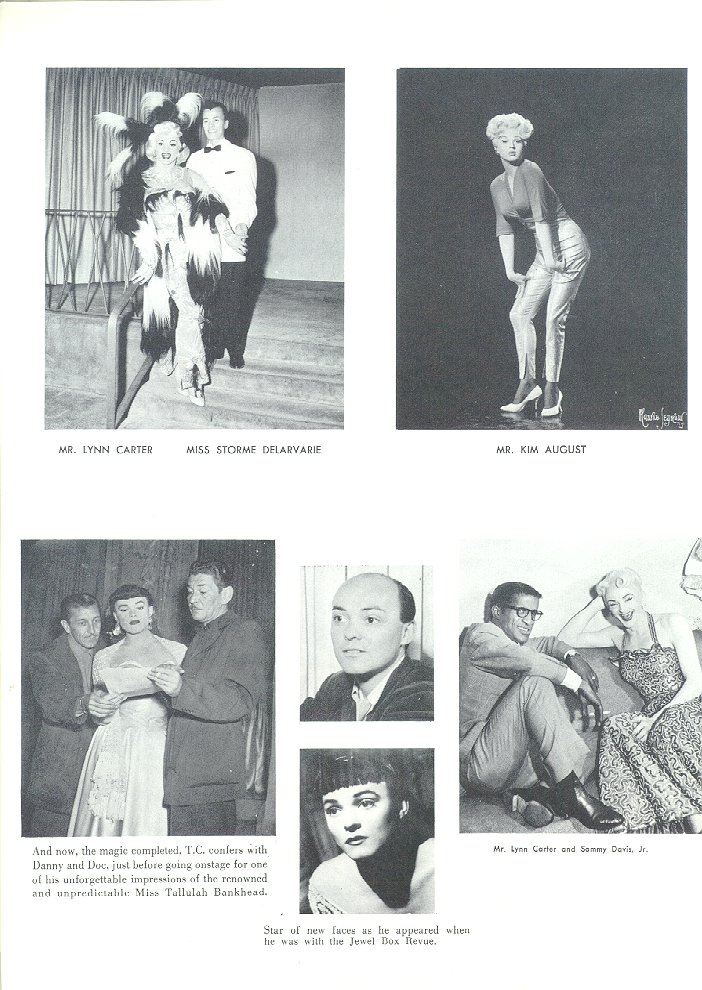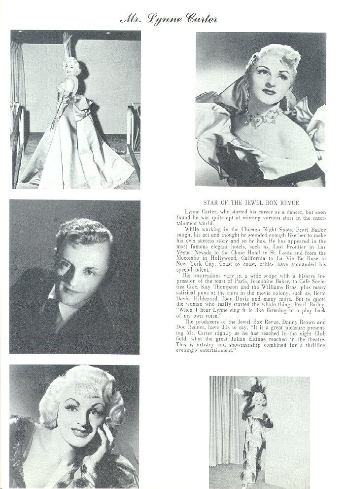 The Jewel Box Revue... The famed Jewel Box Revue was a touring company of female impersonators, that started in 1939 and lasted many years. Below is a program from the revue. It's not dated, but I guess it to be from the early 60s. Lynne Carter is on a few pages scattered through it, as is T.C. Jones. As the program is so rare, I'm showing all 24 pages of it. Yes, I know the pics are large, but I wanted you to be able to read the text.