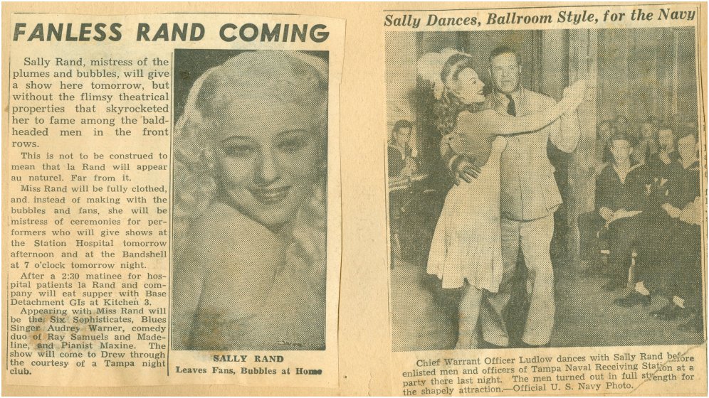 Below, Sally Rand and soldiers, at the JBR Club in Tampa, 1944