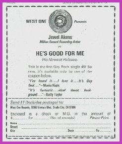 Above, Jewel Akens' very queer 45 from 1973, and below, his CD collection. Further below is a more 2001 pic of him and below that, the ad I found in a September 12, 1973 issue of The Advocate, calling it the "first gay rock single 45." Click for larger scans of the 45 and ad.