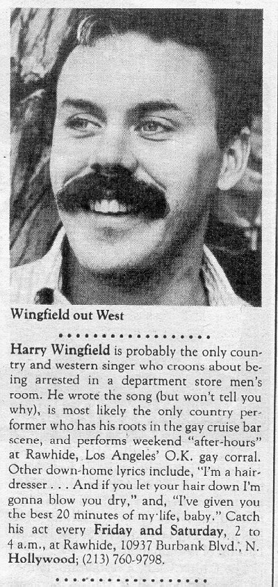 Script for October 2003 QMH David Brown - kiss (1996) Welcome to Queer Voices on KPFT and this segment is called Queer Music Heritage. I'm JD Doyle and I'm here on the 4th Monday of each month to bring you an hour devoted to our culture's music. The music you just heard is kind of a teaser for one of the special segments on tonight's show. It's by New York singer/songwriter David Brown, who you'll hear about later, one of three male artists whose work I'm saluting tonight from the genres of folk-rock and pop, covering the last 20 years. LeRoy Dysart The first artist I'm featuring produced an album that I've admired for a long time, and it's taken me over a year to track him down for an interview. His name is LeRoy Dysart, and in 1982 he released his only album, called "We Are Everywhere." The title song took on almost anthem status immediately after he wrote it. And among other highlights of his musical career was writing the official theme song for the 1982 Christopher Street West Parade, in Los Angeles. It was called "A New Gay Dawning." He's done quite a bit of acting in musicals, and cabaret singing and has composed for choirs and orchestras. He's written with Christian singer Marsha Stevens, and has even written an opera based on the Biblical story of David and Jonathan. The inspiration for his anthem, "We Are Everywhere," came from both from his experience of hearing Sergeant Leonard Matlovich speak at a Pride event, and from watching on television the coverage of the 1979 March on Washington for Lesbian and Gay Rights. I asked him to tell us about it. [LeRoy comments] And then within a few days was the March. You know I could not watch it at home, so I had been invited to some of the peoples' house that I had met at Gay Pride Weekend a few weeks earlier, to come over and watch it on the news. We had a little party and watched it. The local channel showed all of about thirty seconds. But they just showed the camera panning. That whole place was just totally filled, and people were chanting "we are everywhere, we are everywhere," and it just made me cry. I didn't know that many gay existed in the whole world. Coming from Fulton (Missouri), the size of ten thousand people, something like that, I really thought I was the only one. So, as happens, songs just start in my head spontaneously. Just the phrase "we are everywhere" that everyone was chanting had music to it. Here's a little bit of "We Are Everywhere" LeRoy Dysart - we are everywhere (1982) Another very noteworthy song by LeRoy was called "You Did It Out Of Love," and was in a way a thank you song to the organization Parents and Friends of Lesbians and Gays, for the support he received by attending their meetings. [LeRoy comments] LeRoy Dysart - you did it out of love (1982) Do you have any other comments about the song "You Did It Out Of Love"? [LeRoy comments] When I visited LeRoy in Los Angeles last month I was delighted that he told me about Harry Wingfield and this song, because I had never heard of the artist, and I was even more pleased that he loaned me a copy of Harry Wingfield's tape, so that I could share the song with you. From the very rare 1992 cassette tape "Songs of Life, Songs of Love," here's "I Do, I Do, I Do (The Senior Prom Song)." Harry Wingfield - I do, I do, I do (the senior prom song) (1992)